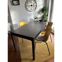 Verkaufe dunklen Holztisch (120x80), ausziehbar (180x80), sehr gut erhalten, kaum Gebrauchtspuren, mit 3 gelben …