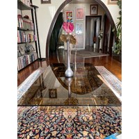 1 Tisch aus weissem Glas 75x75 cm aus silberfarbigen Legierung 1 Tisch aus verbrämbten Glas (amber-gold) auf massiven …