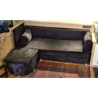 Gut erhaltenes Ecksofa mit Schlaffunktion und viel Stauraum 196x67x40+ 150x67x40cm, Betterweiterung 196x135; Alcantara …
