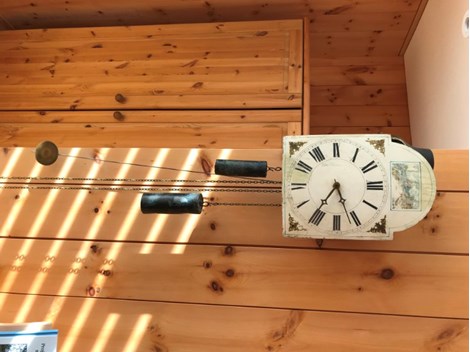 wertvolle antike originale Schwarzwälder Schilduhr mit langem Pendel, Gewichte mit Schnurzügen, Halb- und Stundenschlag.